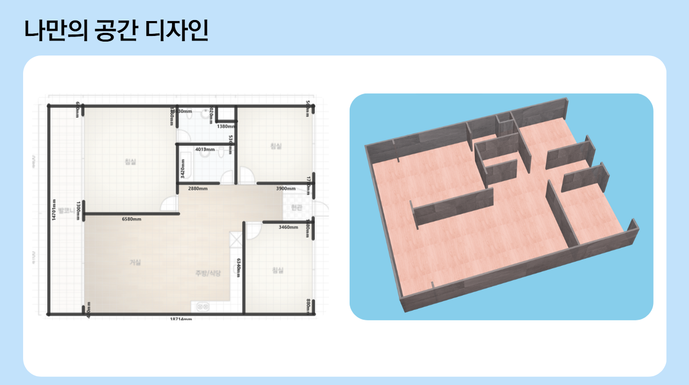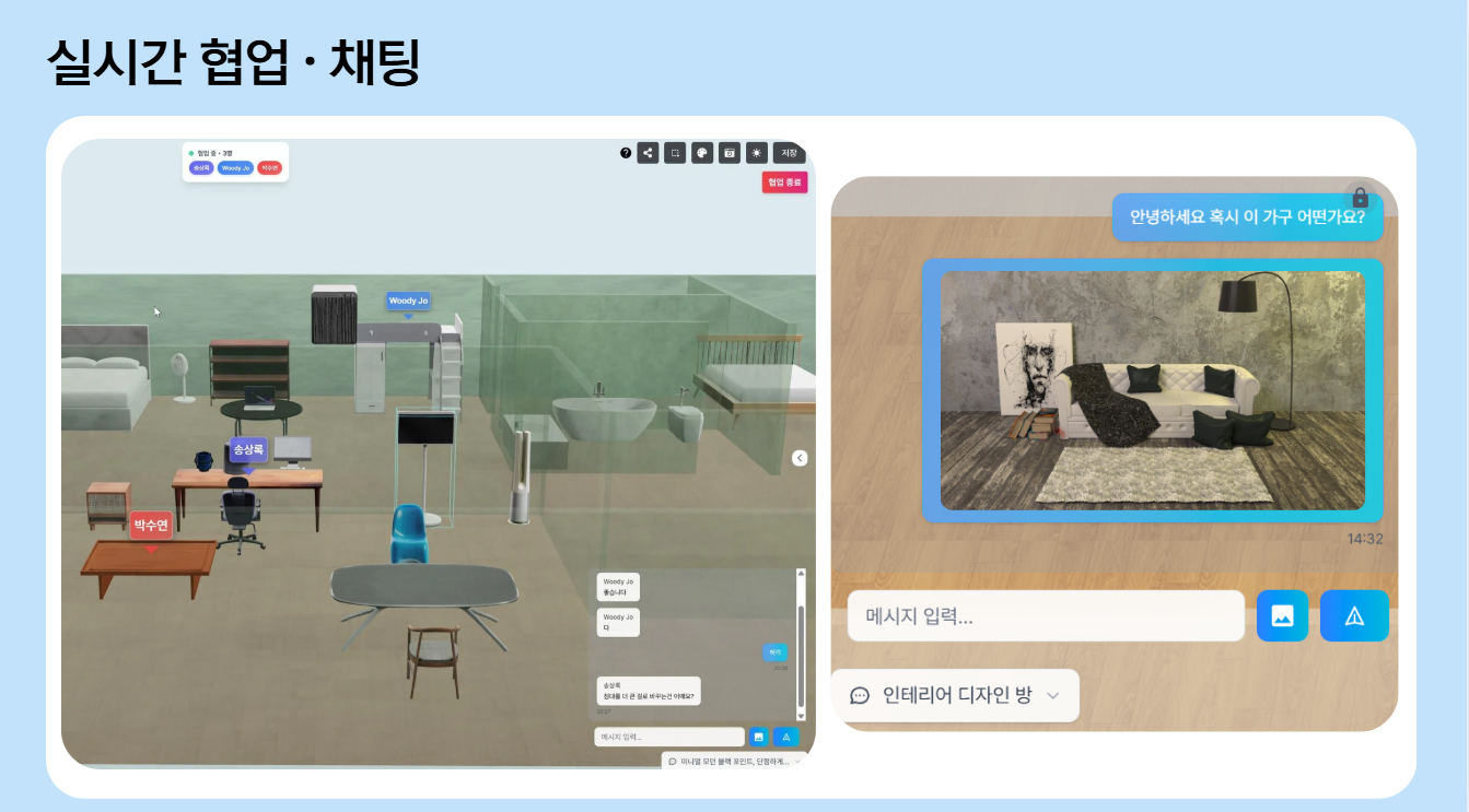 팀 리더로서 프로젝트 기획 및 개발 전 과정을 주도했습니다. 팀원으로서는 가구 모델 관리 및 실시간 협업 (동시편집) 기능 구현을 담당했습니다.