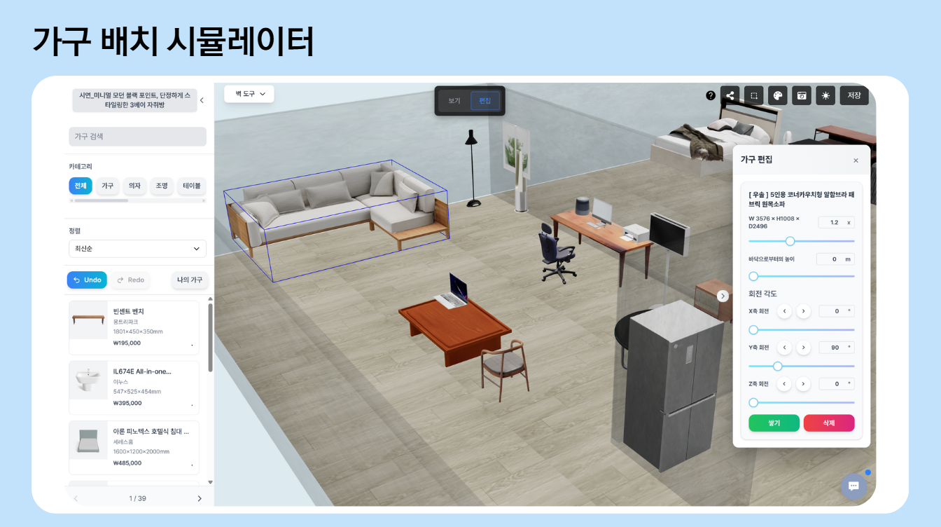 - 가구의 위치, 각도, 높이 등 배치 시뮬레이터 (React Three Fiber)