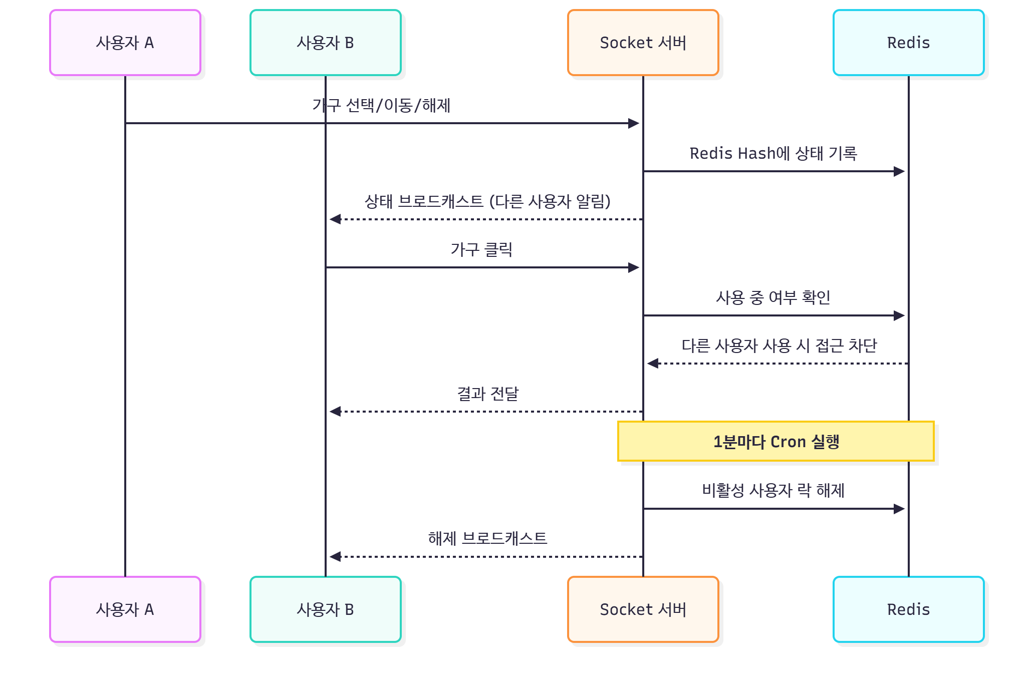 해결: Redis Hash와 Socket.io를 활용한 커스텀 락 시스템을 구현했습니다. 사용자가 가구를 선택하면 Redis Hash에 선택한 가구 ID를 기록하고 다른 클라이언트에 브로드캐스트합니다. 이후 가구를 클릭 시 다른 사용자가 사용 중인지 검사하여 접근을 차단합니다. Cron 작업이 1분간 비활성 사용자의 락을 자동 해제하여, 네트워크 장애로 인한 좀비 락을 방지합니다.